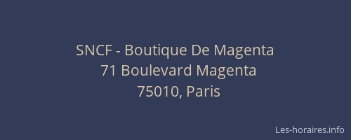 Voici les horaires de SNCF - Boutique De Magenta situé à Paris 10ème,