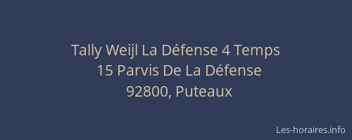 Voici les horaires de Tally Weijl La Défense 4 Temps situé à Puteaux,