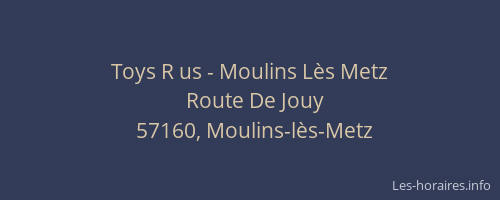 Voici les horaires de Toys R us - Moulins Lès Metz situé à Moulins-lès-Metz,